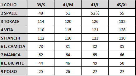 | Taglia | 39/S, 41/M, 43/L, 45/XL |
