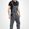 Pettorina da lavoro, bretelle incrociate con elastico interno e fibbie in plastica, con elastico in vita posteriore, chiusura alla patta con bottoni. Un tascone al petto chiuso con cerniera, due tasche anteriori, una tasca posteriore chiusa con bottone, un porta metro su gamba destra. Apertura laterale a destra chiusa con bottone, cuciture di colore a contrasto.